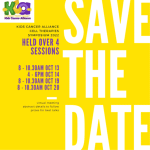 On Posted on July 27, 2022July 27, 2022 by KCA Administrator to Uncategorized KCA Cell Therapies Symposium 2022 – Save the Date Abstract submission and program details will be circulated soon PreviousPrevious post:Women in IT: KCA bioinformatician shows how it’s done NextNext post:CALL FOR ABSTRACTS – Kids Cancer Alliance Cell Therapies Symposium 2022
